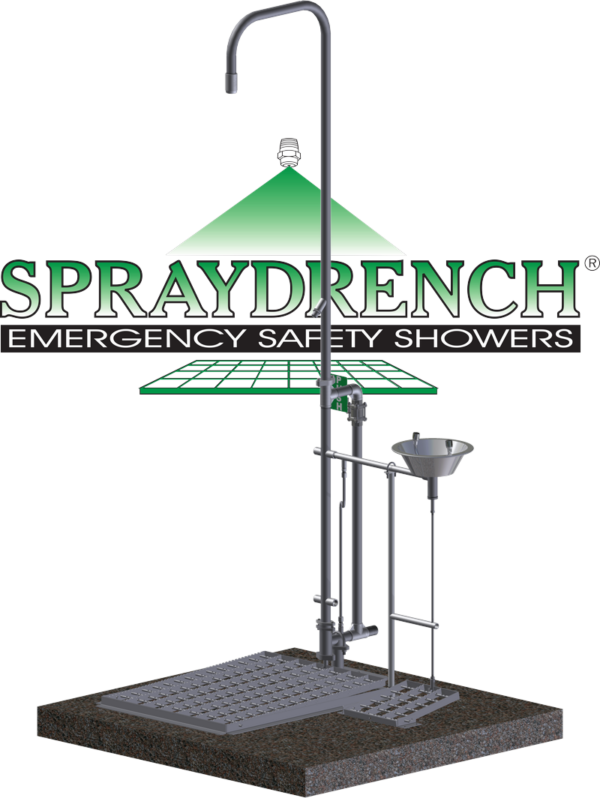 Platform Operated Single Column Drench Shower with Manual Push Override c/w Platform/Foot Operated Emergency Eyewash Station c/w Twin Aerator Nozzle with Dust Caps